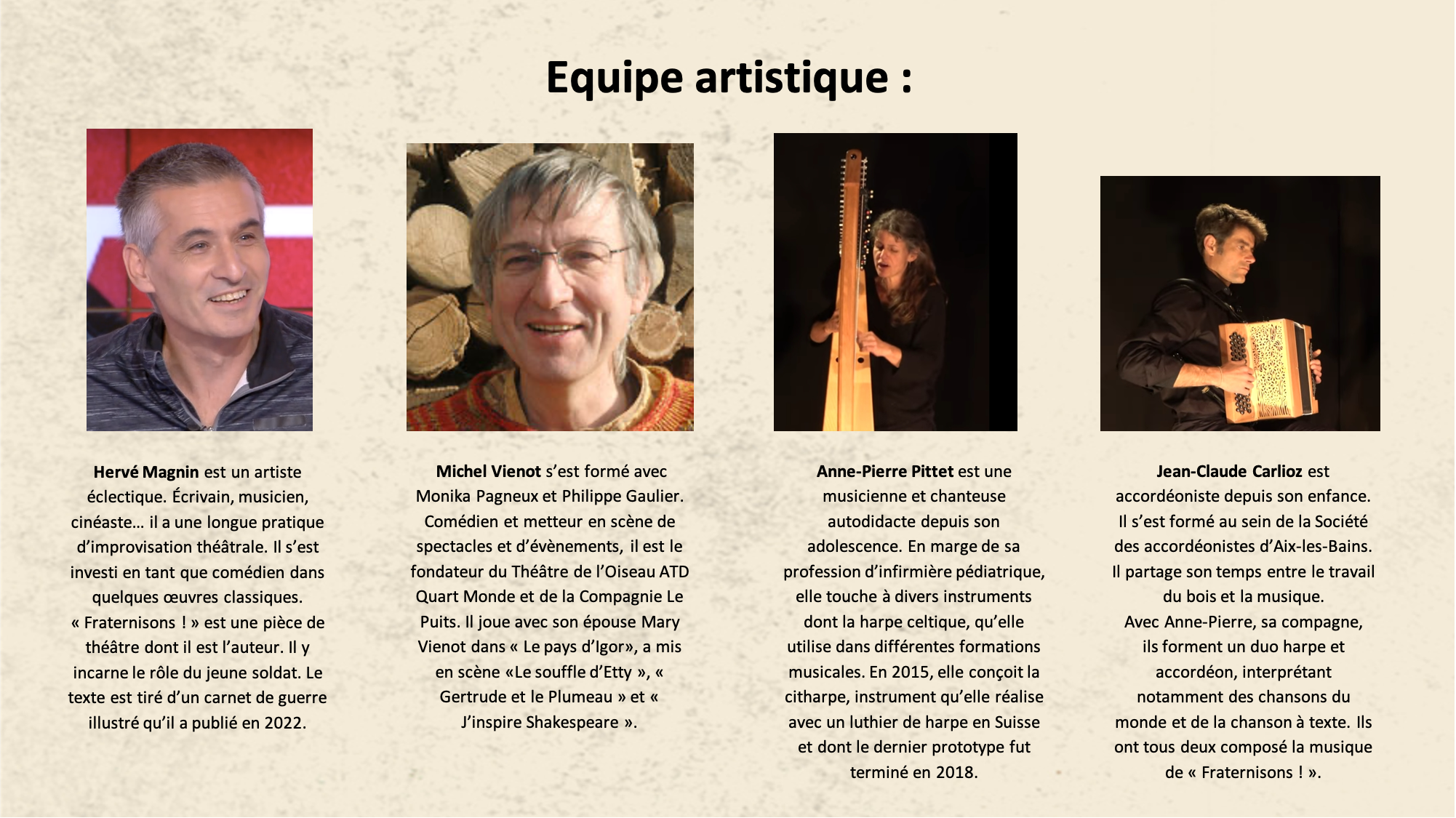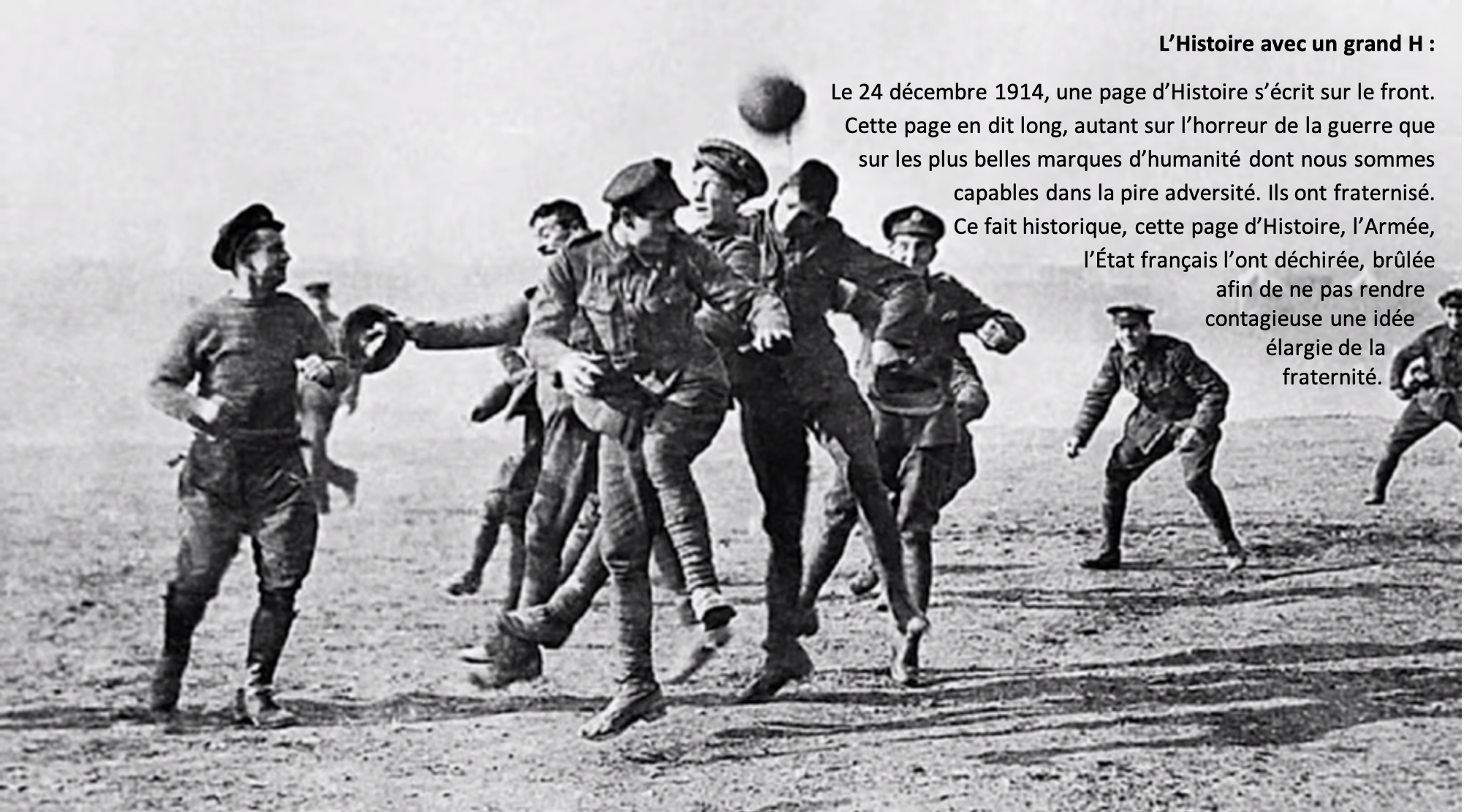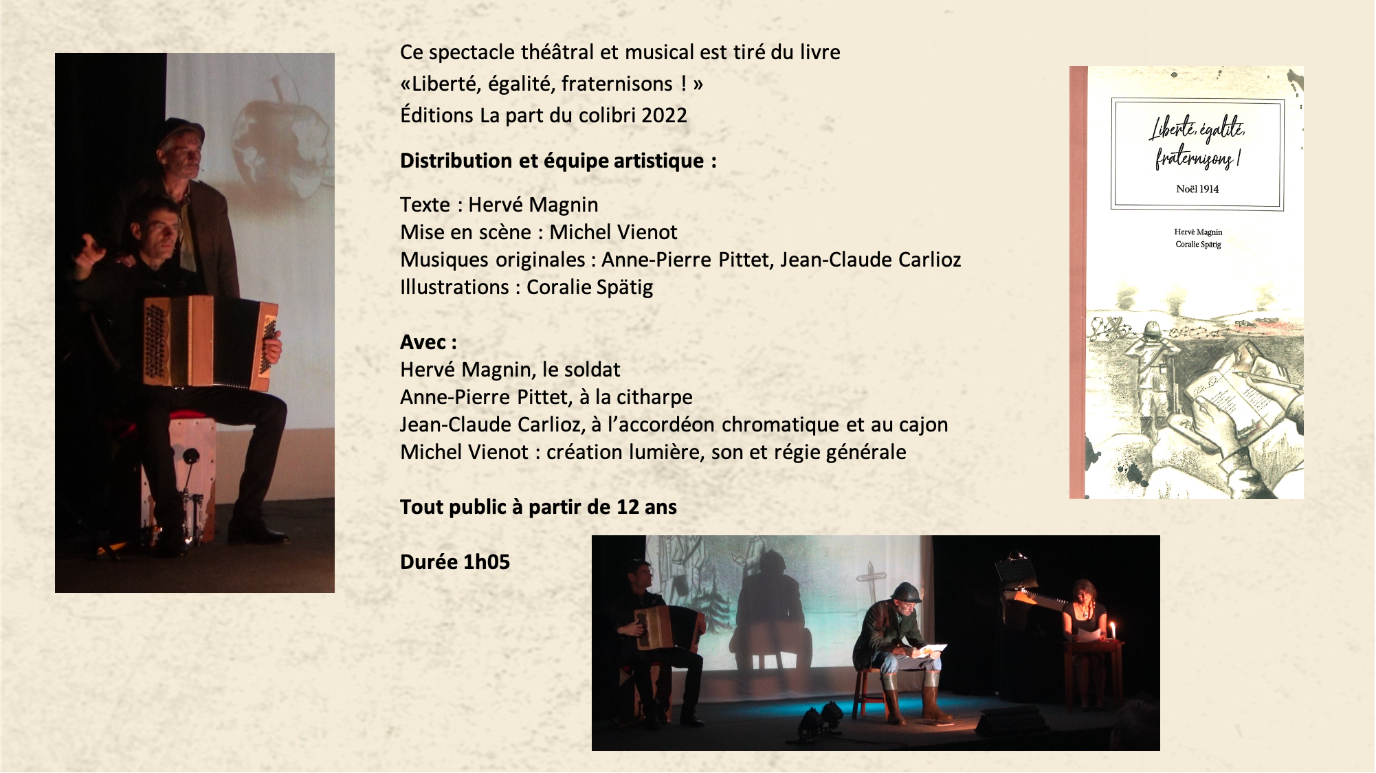 Librement inspiré de « Joyeux Noël », le film de Christian Carion, ce spectacle théâtral et musical met en scène un jeune soldat de moins en moins convaincu de la légitimité de la guerre qui oppose les Boches et les Franzacken en 1914. Arrivés au front, chargés de préjugés haineux, les ennemis se font face mais peu à peu, l’absurdité de cette guerre trace un sillon dans l’esprit des hommes. A Noël, au cœur de l’horreur, un élan fraternel rapproche pourtant des cousins plus ou moins germains. Forcé comme ses camarades de reprendre les combats, puni pour avoir osé tendre la main à l’adversaire, il se prend à rêver de voyages, de paix, de fraternité entre les peuples. Au cours de la trêve de ce Noël 1914, une page d’histoire s’écrit, une page que l’Armée française déchira et brûla afin de ne pas rendre contagieuse une idée élargie de la fraternité.