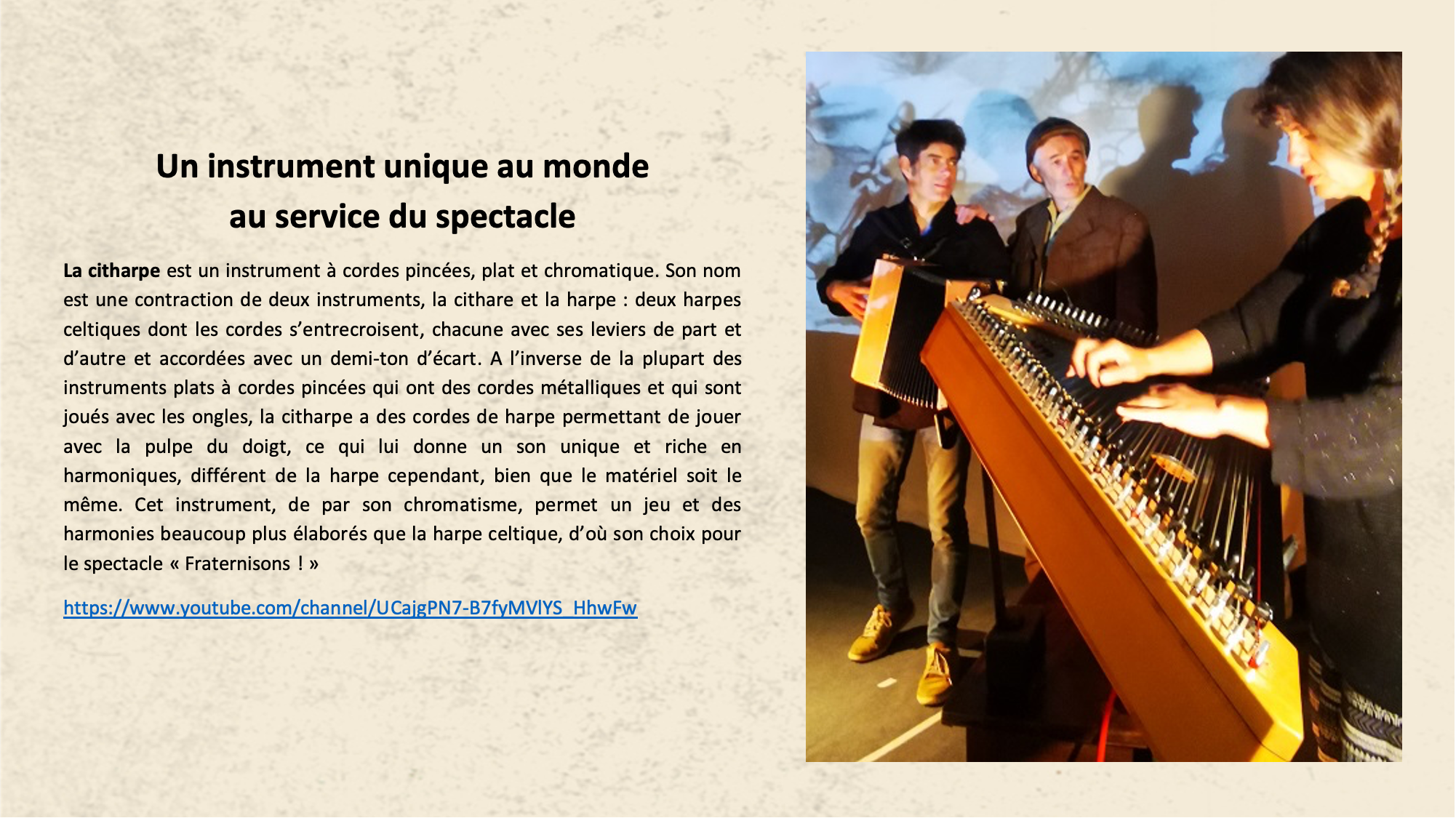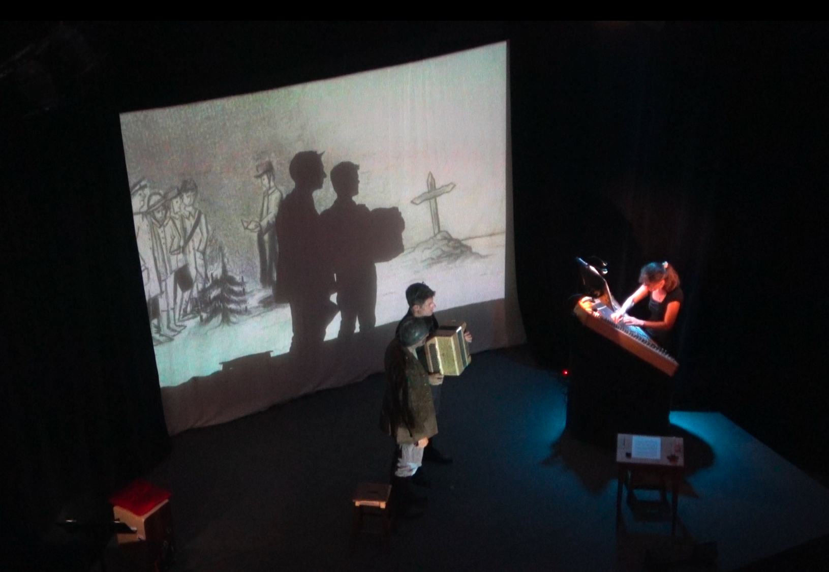 Un texte poétique dit par un comédien qui se fond dans les images, son ombre jouant avec le décor. De chaque côté de la scène, deux musiciens accompagnent à la citharpe, au chant et à l’accordéon un texte profond qui emmène le spectateur dans un univers onirique, offrant le meilleur au milieu du pire, du beau au cœur de l’horreur. Au fil du spectacle, les musiciens incarnent des rôles plus ou moins fantomatiques.
